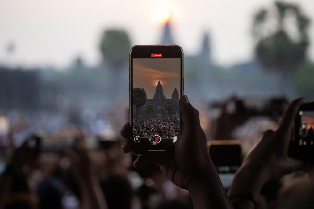 22 марта, провинция Сиемреап, Камбоджа. Турист фотографирует восход солнца над центральной башней храмового комплекса Ангкор-Ват. /Фото: Синьхуа/