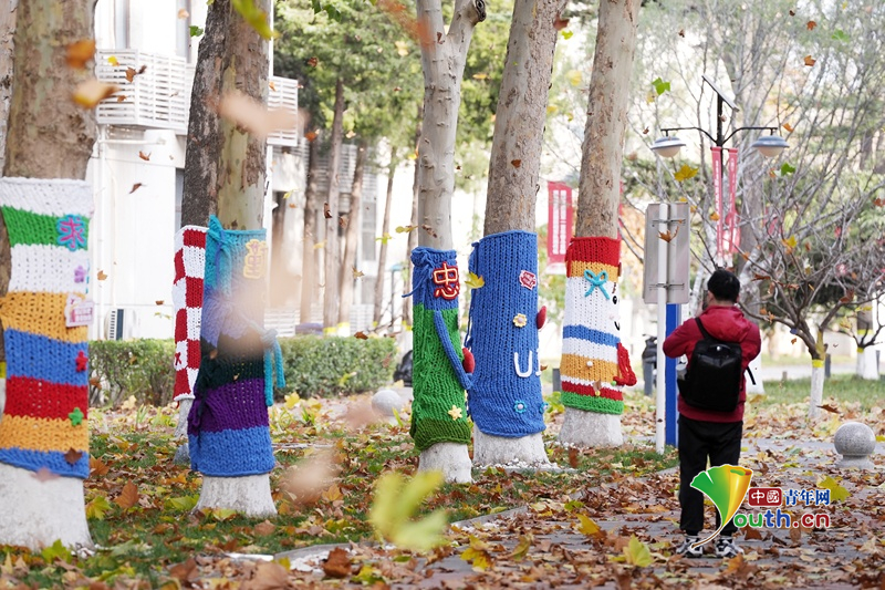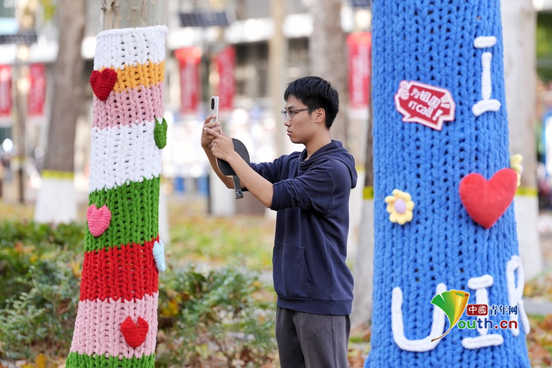 Пекин, 13 ноября (Youth.cn) - 12 ноября 2025 года студент фотографирует 《свитеровое дерево》 в кампусе Университета международных отношений в Пекине. Недавно, с наступлением холодов, университет украсил некоторые платаны на территории кампуса вязаными свитерами, привлекая студентов и преподавателей позировать и фотографироваться. Фото/CFP