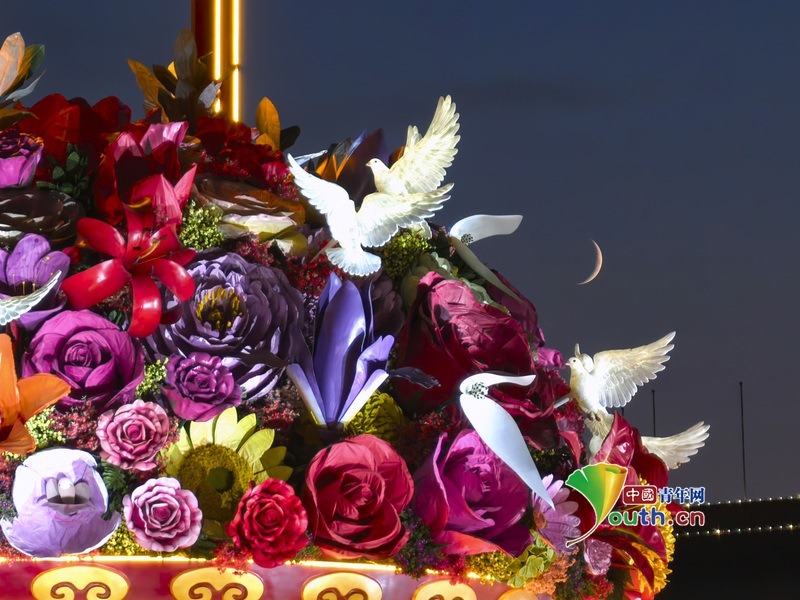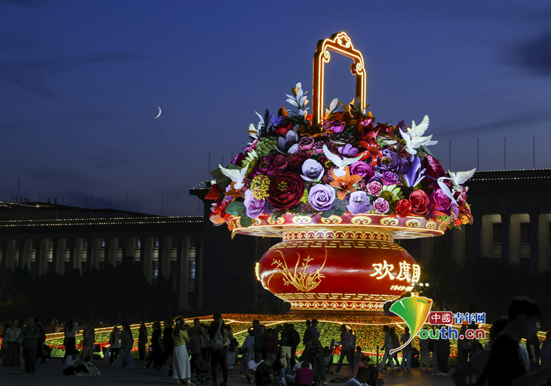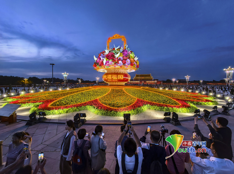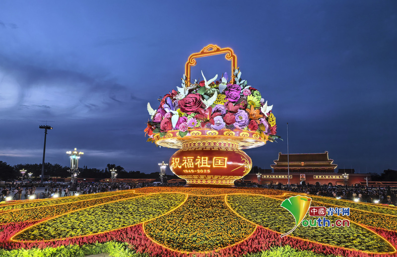 Пекин, 26 сентября (Youth.cn) - 25 сентября 2025 года гигантская цветочная корзина в центре Дня образования КНР на площади Тяньаньмэнь была полностью завершена. Она была подсвечена ночью и эффектно дебютировала. Фото/CFP