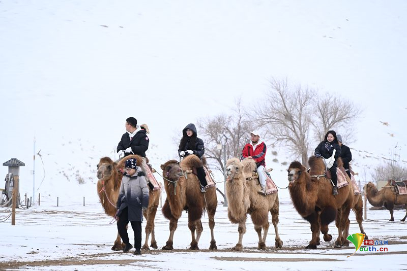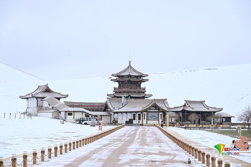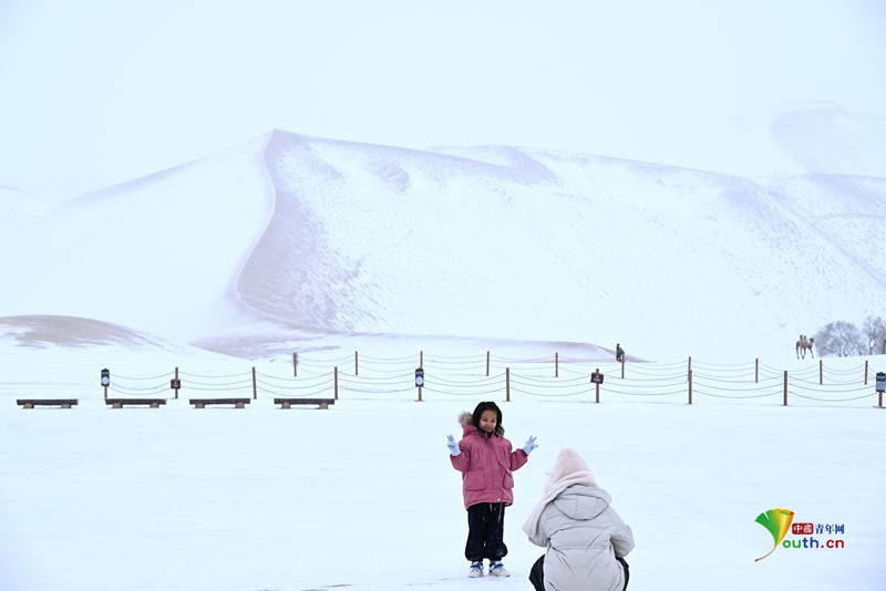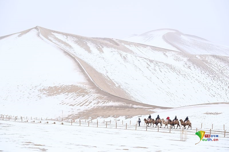 Пекин, 26 ноября (Youth.cn) - 23 ноября 2025 года в городе Цзюцюань провинции Ганьсу, когда выпал первый в этом сезоне снег, живописный район 《Гора Минша и Источник Полумесяца》 был окутан белоснежным покровом, создавая живописное зрелище. Фото/CFP