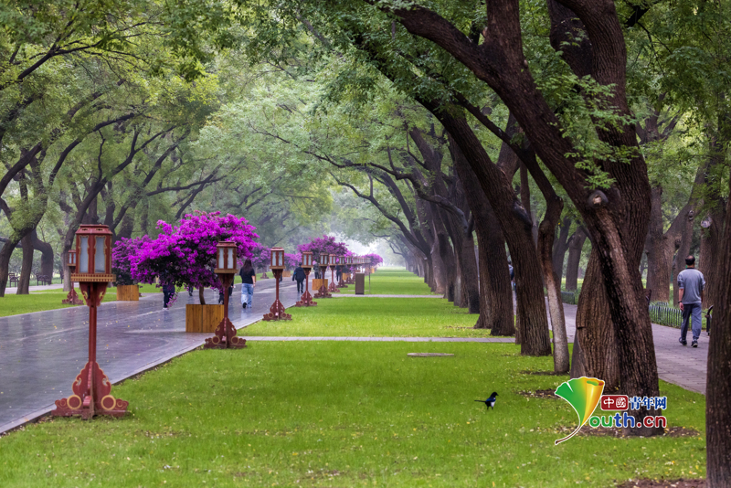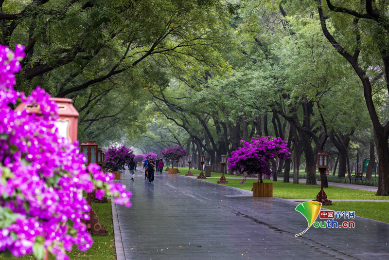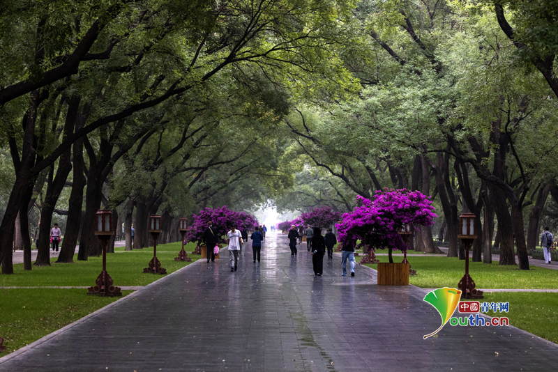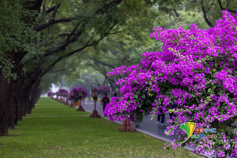 Пекин, 25 сентября (Youth.cn) - 24 сентября 2025 года в Пекине Центральная улица у Храма Неба была украшена бугенвиллеями. Фото/CFP
