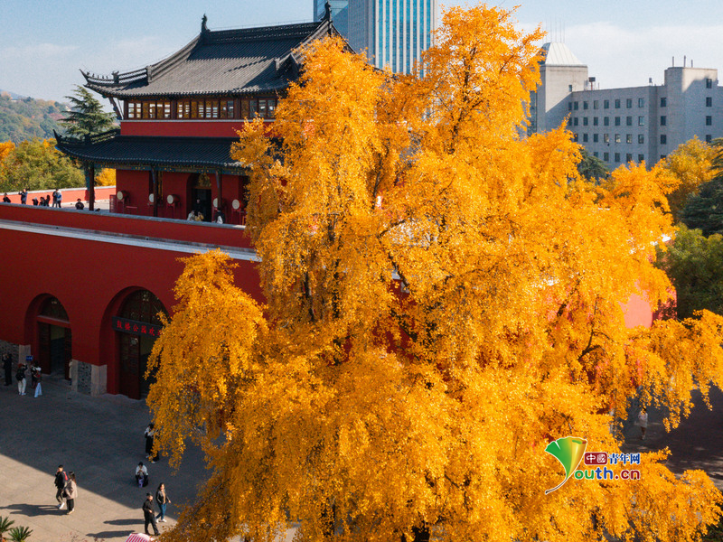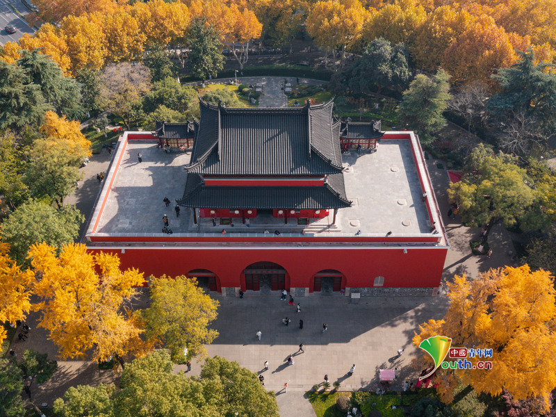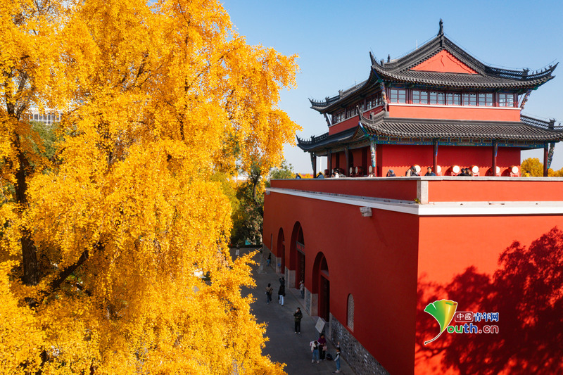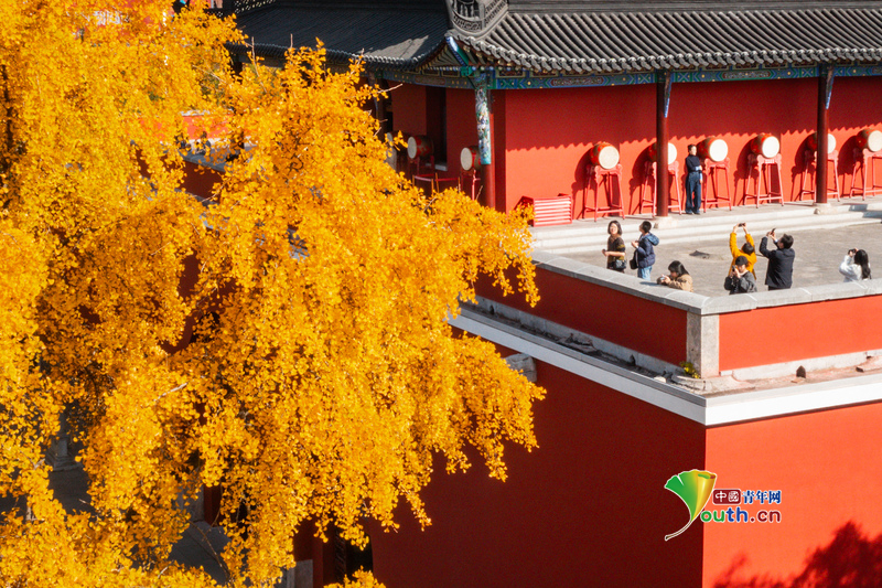 Пекин, 2 декабря (Youth.cn) - 30 ноября 2025 года посетители наслаждаются пейзажем в парке Барабанной башни в Нанкине. В начале зимы деревья гинкго в парке светятся золотистым светом, создавая живописный контраст с красными стенами исторической архитектуры и привлекая множество туристов. Фото/CFP
