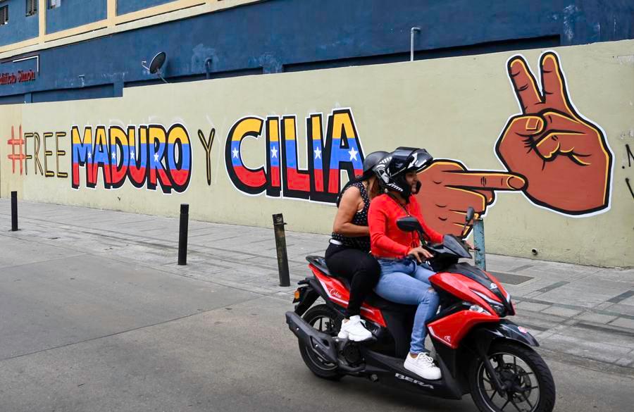 12 января, Каракас. Мотоцикл проезжает мимо стены с граффити "Свободу Мадуро и Силии /супруге Н. Мадуро/". /Фото: Синьхуа/
