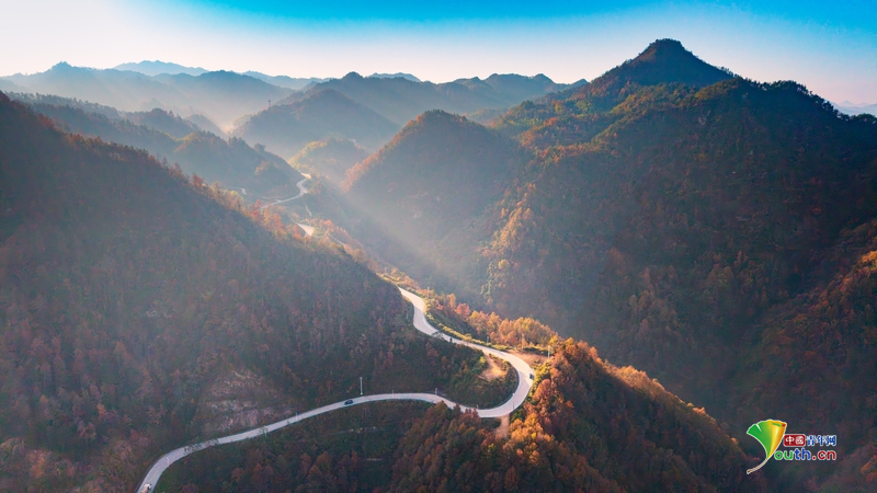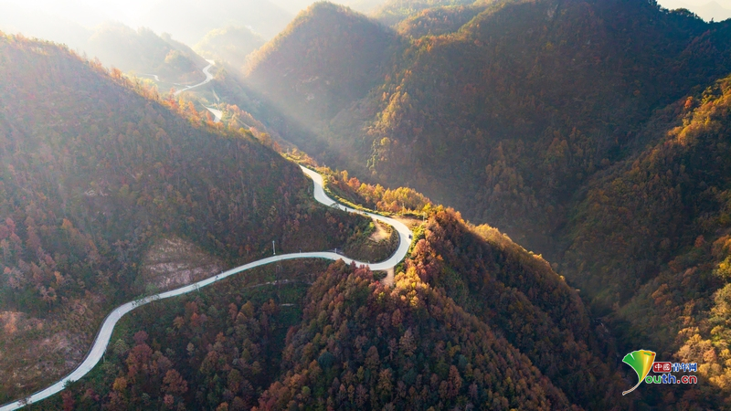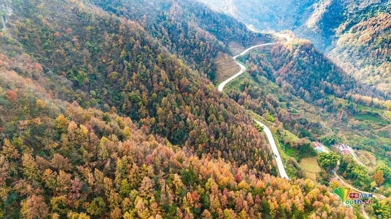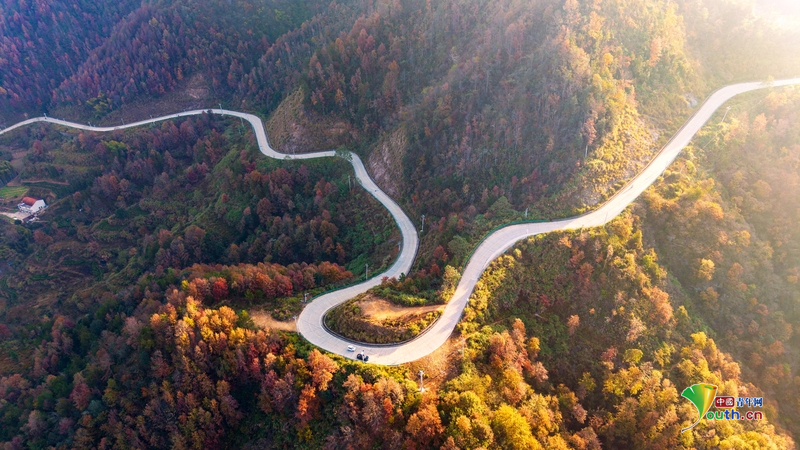 Пекин, 26 ноября (Youth.cn) - 24 ноября 2025 года линия Мэйша, живописная сельская дорога в городе Хуанган провинции Хубэй, пролегала через леса, расцвеченные разноцветными красками, создавая неповторимую красоту раннего зимнего сезона. Фото/CFP
